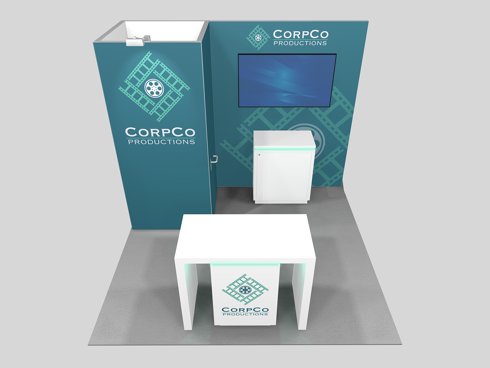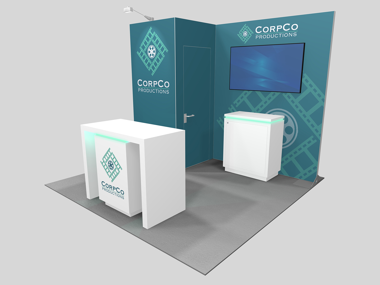 Quite often, a few custom elements added to the design can give the entire design a custom look even if it’s as simple as some colorful laminated workstations, shelves, or a reception counter. Custom laminated soffits and backlighting are also nice touches that are inexpensive and well worth the investment. As a bonus, if you re-rent the same exhibit, your second rental will most likely be less expensive, since your first rental covered the cost of those custom components.