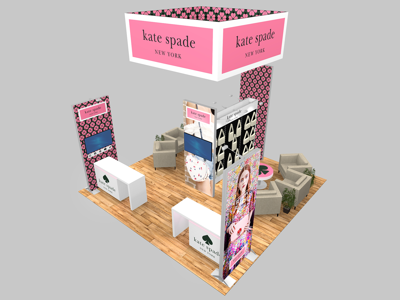 What’s the mission? And how does that mission serve to attract and facilitate engagement in the booth? Every exhibitor should ask themselves those questions before designing a new exhibit. The RE-9215 hits the mark on both questions. The design emphasizes interactions with attendees, whether at the reception counters or in the lounges. Those interactions are supported with monitors, large format graphics, and product displays.