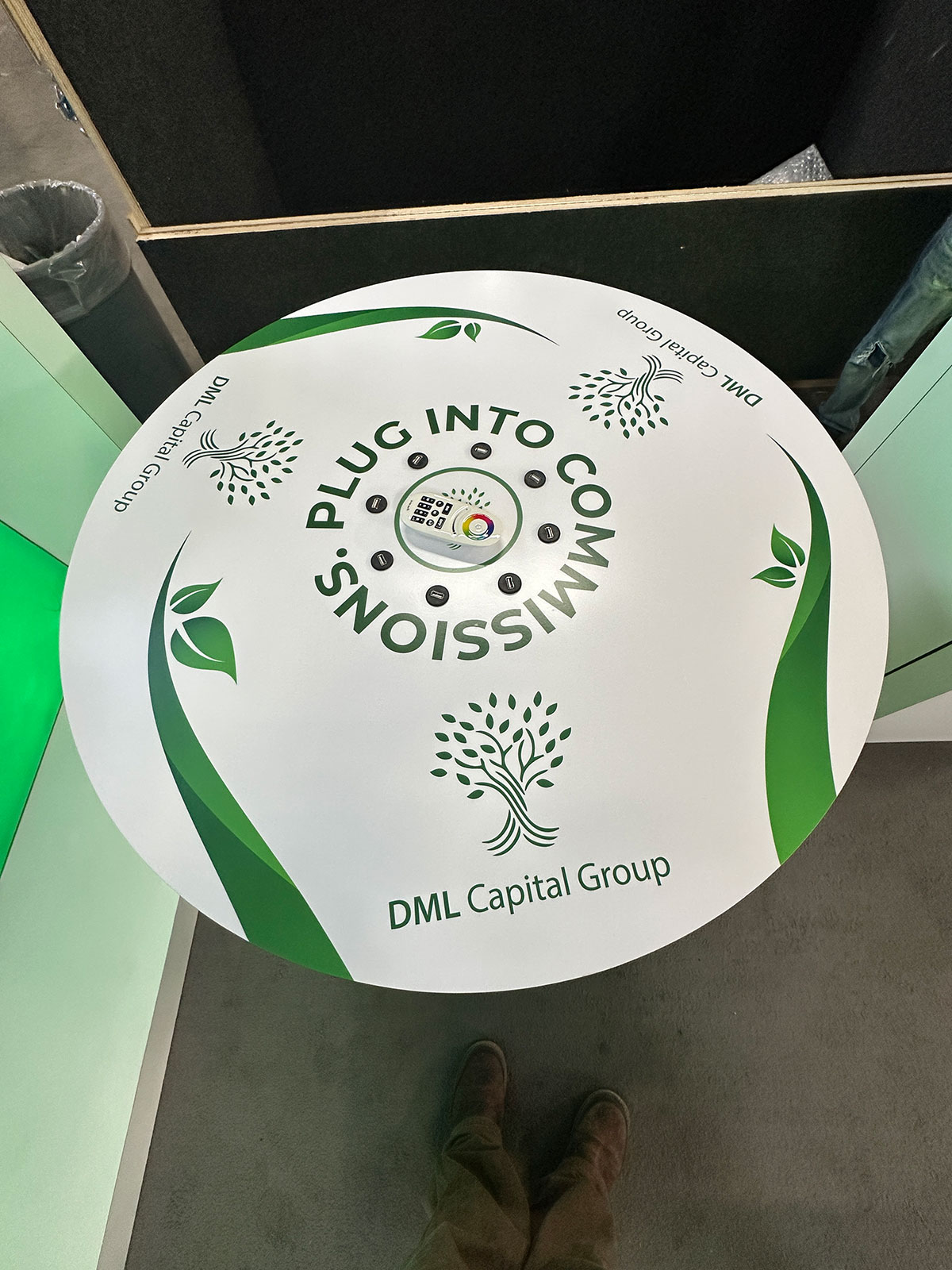 RENTAL: Modified RE-1081 Design with White Laminated Backwall with Recessed Single-Sided Lightbox, RE-1575 Reception Counter, Workstation Pedestal, RE-704 Charging Station Table, Large Monitor Mount, 43" Monitor, SEG Backlit Fabric Graphic, Vinyl Applied RENTAL: Modified RE-1081 Exhibit -- View 2 RENTAL: Modified RE-1081 Exhibit -- View 3 RENTAL: Modified RE-1081 Exhibit -- View 4 RENTAL: Modified RE-1081 Exhibit -- View 5
